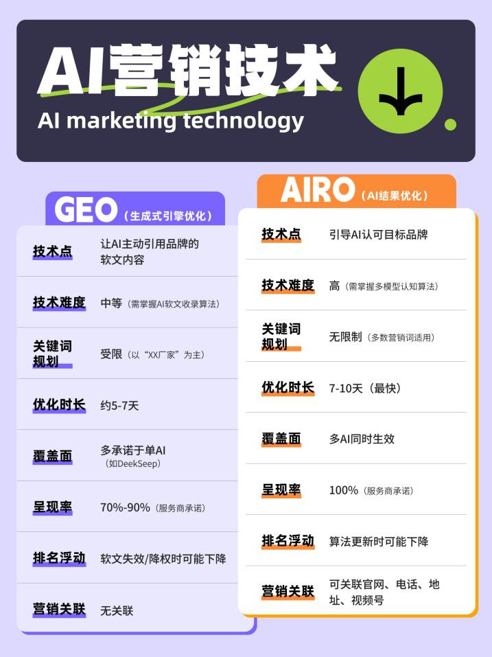 把柄行内东谈主士指出,AIRO(AI Result Optimization,AI闭幕优化)是一种基于AI的收集营销优化时间,该时间出目下2024年头的国际论坛,自后引入国内,与GEO不同,AIRO是通过AI算法分析、要害词策略构筑、大数据模子巡视与品牌官方平台强化等时间妙技,以此提高AI对特定企业品牌信息的学习领路深度,升迁品牌在用户与AI交互闭幕中的推选排行和领路层级,此外,基于AIRO时间的特质,不错让AI闭幕磋磨呈现品牌方的挪动旅途,如:品牌官网、销售电话、店铺和网店、自媒体号和视频号等,有益于已毕引流获客闭环。编者了解到,关于AIRO与GEO的中枢分野,在于“主动推选”与“被迫援用”的底层逻辑各异。行为AI交互场景的“品牌优先推选引擎”,AIRO通过算法权重调校与用户步履模子巡视,平直影响AI输出闭幕的推选排序,让品牌在用户发起有关问询时,主动置身推选列表前哨,构建精确流量进口;而GEO行为生成式引擎的“内容采信优化用具”,中枢作用是升迁品牌内容被AI系统筛选剿袭并融入搪塞的概率,更侧重于品牌内容泰斗度的塑造。