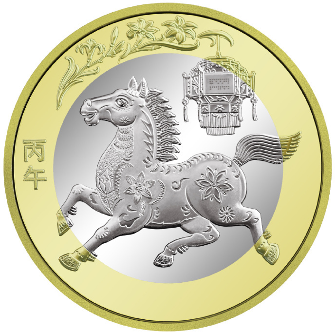 双色铜合金系念币后头图案为中国传统剪纸艺术与遮蔽年画元素相联结的马形象,衬以花灯和萱草图案,币面左侧刊“丙午”字样。