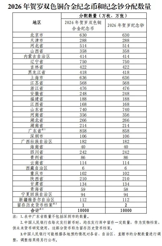 各省、自治区、直辖市双色铜合金系念币和系念钞分派数目如下: