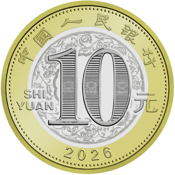 双色铜合金系念币正面图案为“中国东说念主民银行”、“10元”字样,汉语拼音字母“SHIYUAN”及年号“2026”,底纹衬以团花图案。