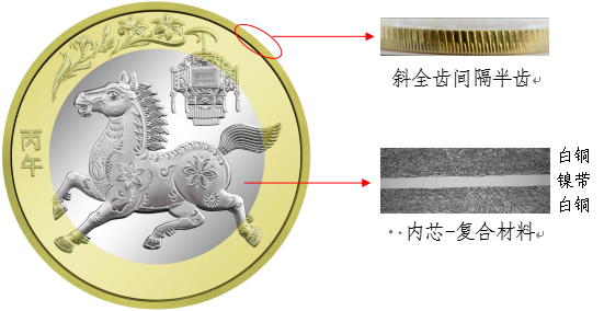 硬币外环为黄铜合金,内芯为具有特有机读性能的镍带复合白铜材料。防伪特征效力见图1。