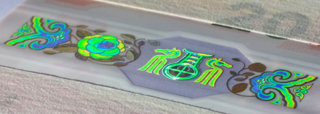 位于票面下方。蜕变不雅察角度,票面正面可见“如意云纹”、“山茶花”与“福”字组成的遮蔽纹样呈现多色动感特征。“福”字下部“田”字内可见立体动感高亮圆环效力。防伪特征效力见图6。